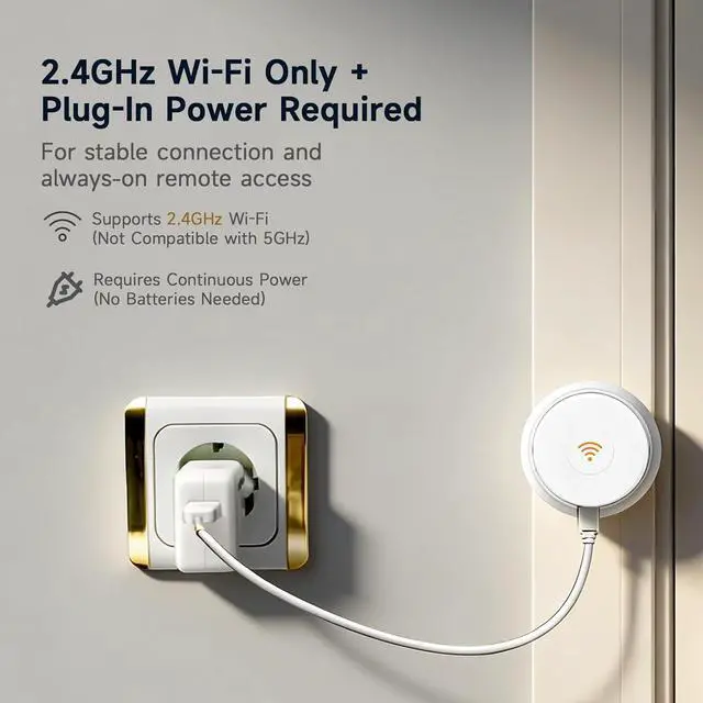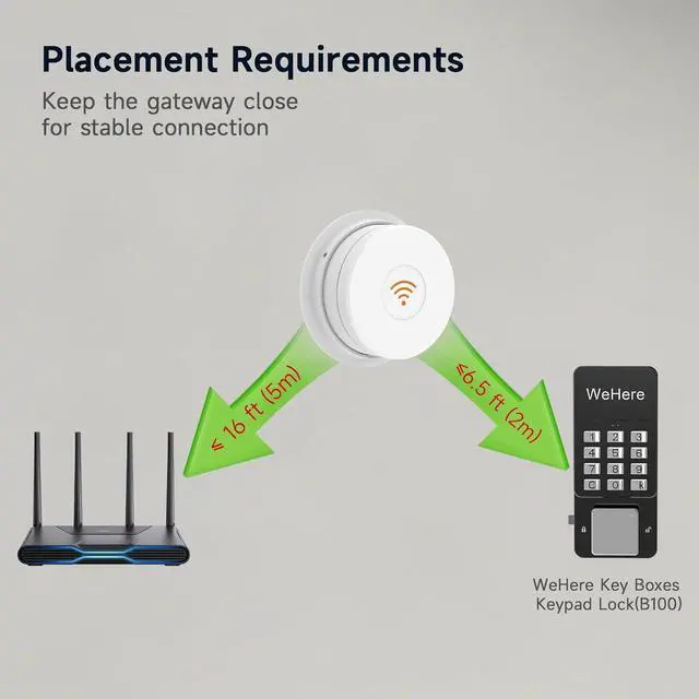 2.4GHz Wi-Fi Only + Placement Requirements Supports 2.4GHz Wi-Fi networks only (not compatible with 5GHz). For stable connection, keep the gateway within 16 ft (5 m) of your Wi-Fi router and within 6.5 ft (2 m) of the WeHere key box.
