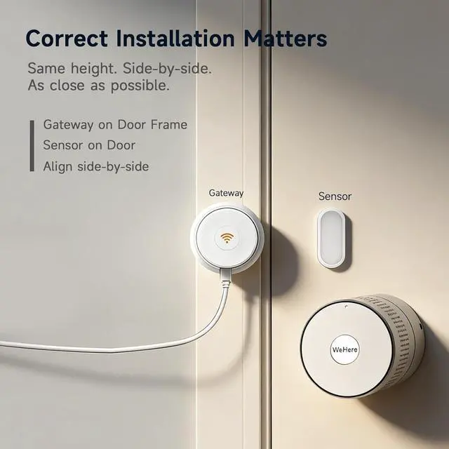 Align Sensor & Gateway Side-by-Side for Accurate Detection Install the gateway on the door frame and mount the magnetic sensor on the door at the same height, positioned side-by-side and as close as possible. When the door opens and the sensor moves out of range, the gateway instantly sends an alert in the app.