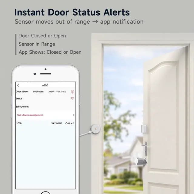 Includes Magnetic Door Sensor for Instant Alerts The W100 gateway includes a magnetic door sensor that detects open/close status and sends real-time notifications to your phone for better security and monitoring.