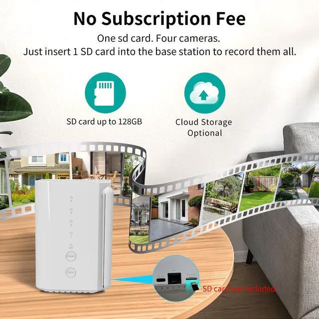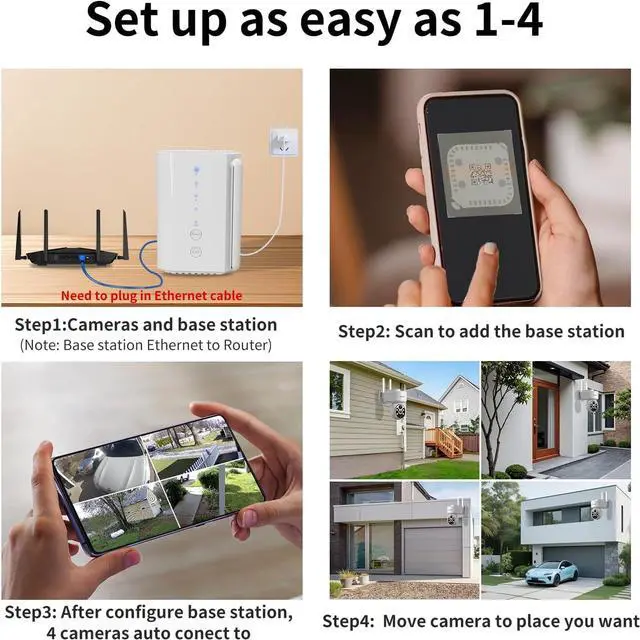 Solar Powered Cameras Easy install This kits comes with 4 solar powered outdoor camera. And the 4 cameras already pre match up to the base station, you just need to connect lan to based station, scan QR code on home base, then turn on camera, then you could liveview successfully. One time hoop up, then 4 cameras image come out. The based station support max 128G SD card. All videos could be saved in based station SD card, no need 4 SD card. The camera is solar powered, no need cable, easy to move camera to where to you want to, and also look good.