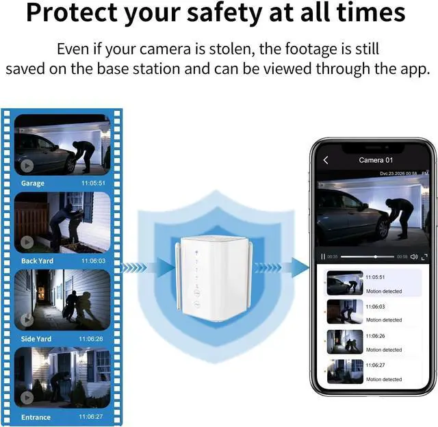 Instant Alerts &Siren & Flashlight Home security camera. When a stranger in camera view outside of your house. You would receive message in seconds,You could see who comes and goes. Siren and flash spotlight could be set to automatic when people come in camera view or mannual turn on. The motion zone feature is free for you. You could cover the area you don't want to receive notification(like street). Reduce fault alert, focus on the important matter