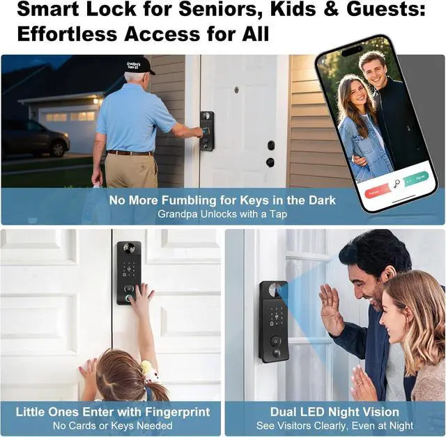 Voice Control, Auto-Lock & Unlock Logs: Connect it to 2.4GHz WiFi to use voice commands with Alexa or Google Assistant (e.g., Unlock the front door or Check lock status) for hands-free convenience. It also auto-locks after the door closes, and you can view unlock video logs or get anti-pry alerts via the Tuya Appno more second-guessing security