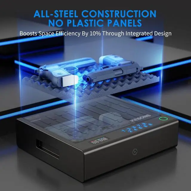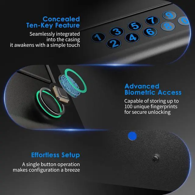 3 Ways of AccessOur pistol safe offers three swift access modes, powered by 4 AAA batteries, responding in just 0.1 seconds. With a 98% fingerprint success rate, it efficiently safeguards your security. In addition to advanced fingerprint options, the handgun safe features a 0-9 numeric keypad, providing comprehensive security for your home. The backup key option ensures easy and quick access to your firearms at any time. (Please note: Do not store backup keys inside the firearm safe for safety reasons.)