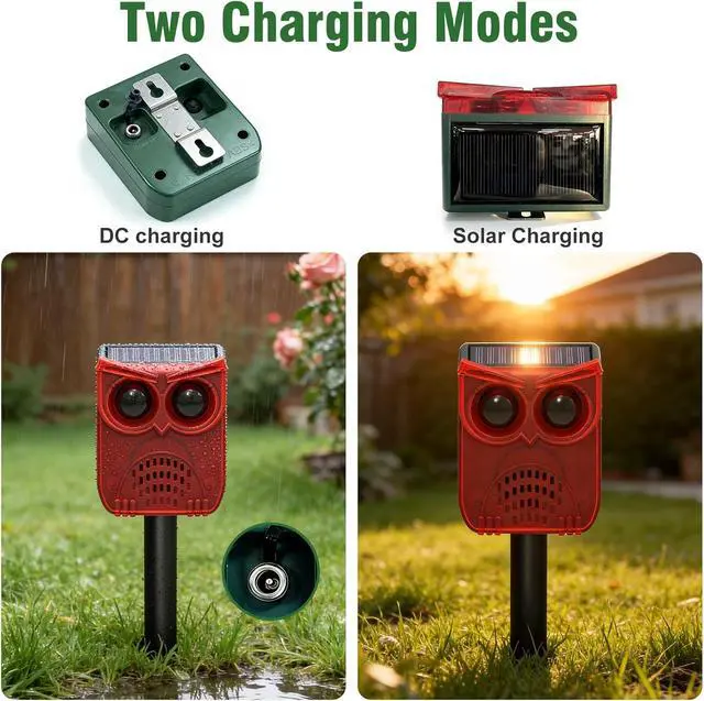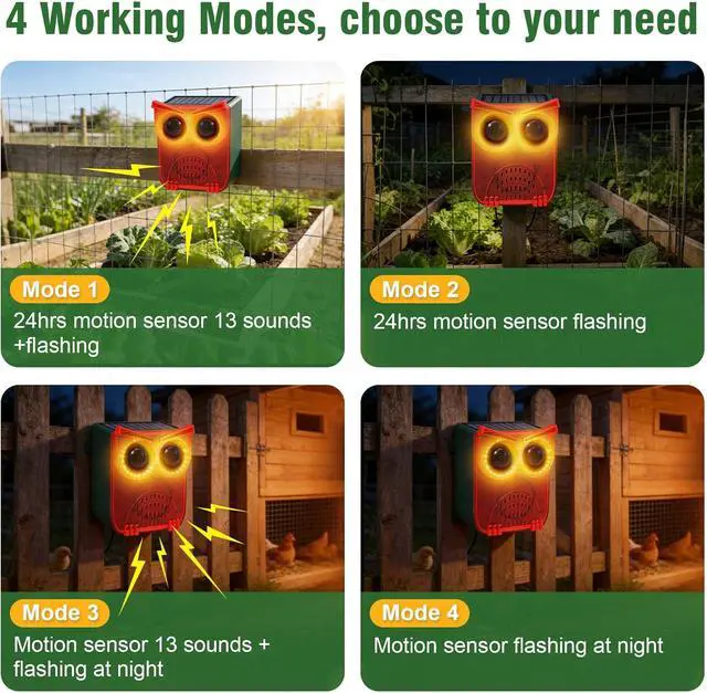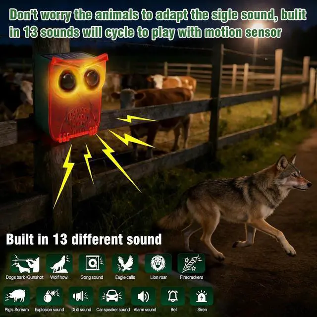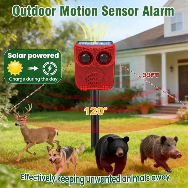 Drive Animals Away in a Humane Way:The built-in motion detection sensor is highly sensitive and will trigger at an angle of 110 degrees and 25-33 feet distance range,the loud up to 129dB. It can effectively drive away deers, raccoons, bears, coyotes,cats, dogs, skunks, foxes and other animals to protect your plants, gardens and other properties