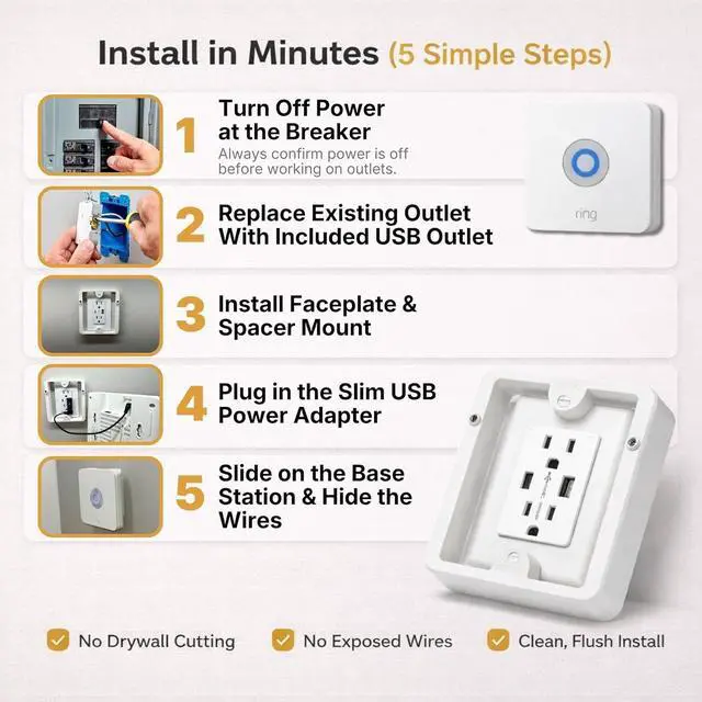 KIT - The complete kit includes everything you will need to upgrade an existing electrical outlet to be able to vertically mount a Ring Alarm Base Station Gen 1 & 2 or ASUS Lyra Mini: TwoUP Tech Mounting Bracket, Upgraded Electric Outlet & Faceplate, Shortened Barrel Power Cable with Adapter, Extended Outlet Fasteners.