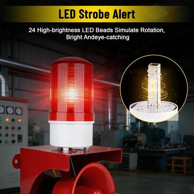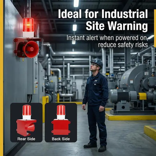 Powerful Audible Warning: Features a 120 dB loud siren that delivers an unmistakable alert The horn is designed for optimal sound propagation, ensuring the alarm is heard clearly across factories, warehouses, and large facilities