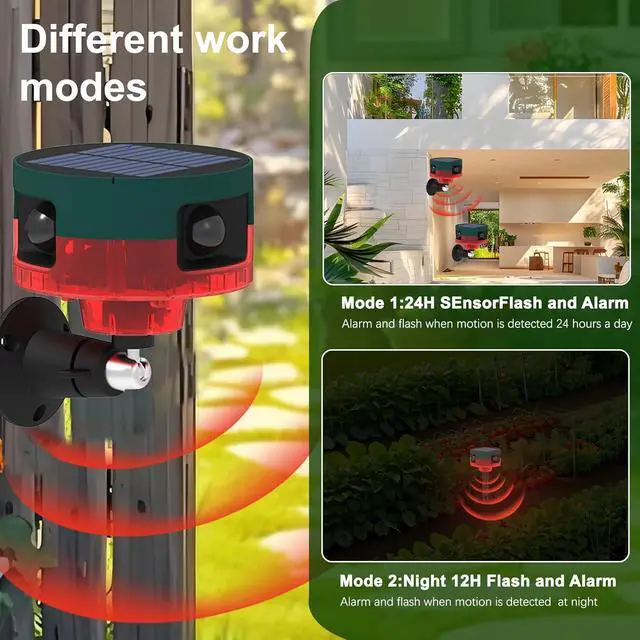 2 Works Modes: Mode 1:Full day(24h) motion sensor & sound alarm,Mode 2:Night motion sensor flash & sound alarm.