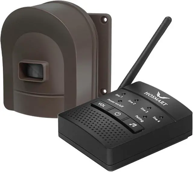 HOSMART ADVANTAGES - We possess leading wireless technology and own our own factory. All our Wireless driveway alert systems are manufactured in our own facilities. This Driveway Alarm set includes 1 Base Receiver and 1 Brown Sensor powered by AA batteries. Note: The square receiver has been newly upgraded and features an added ringtone selection button, offering a choice of 38 fun ringtones. This new square base station comes with an adapter.