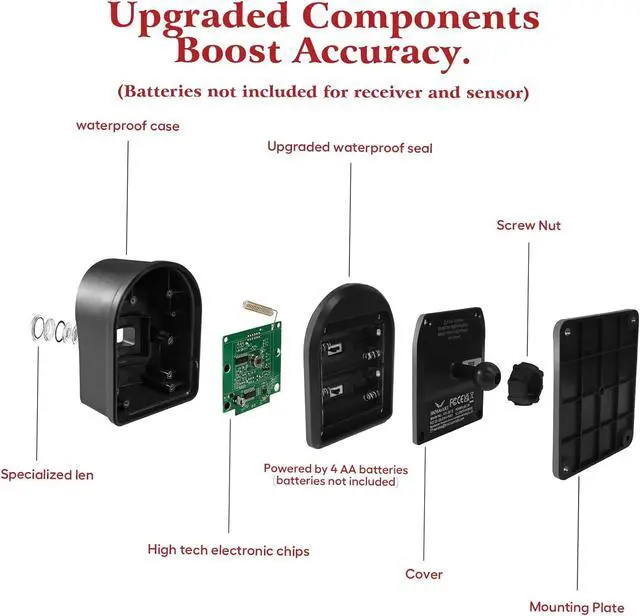 EXCELLENT QUALITY - Outdoor driveway alert sensor system is made with industrial-grade PVC housing, rubberized weather/water-resistant seal, and a sunshade. Power on the sensor with 4pcs AA 1.5V AA batteries(not included in the package) and turn on the receiver with the cable or AA batteries. After the batteries are inserted, the sensor's power can last for approximately one year, making it very durable. 2 YEAR WARRANTY on parts and workmanship. 90-DAY RISK-FREE OFFER