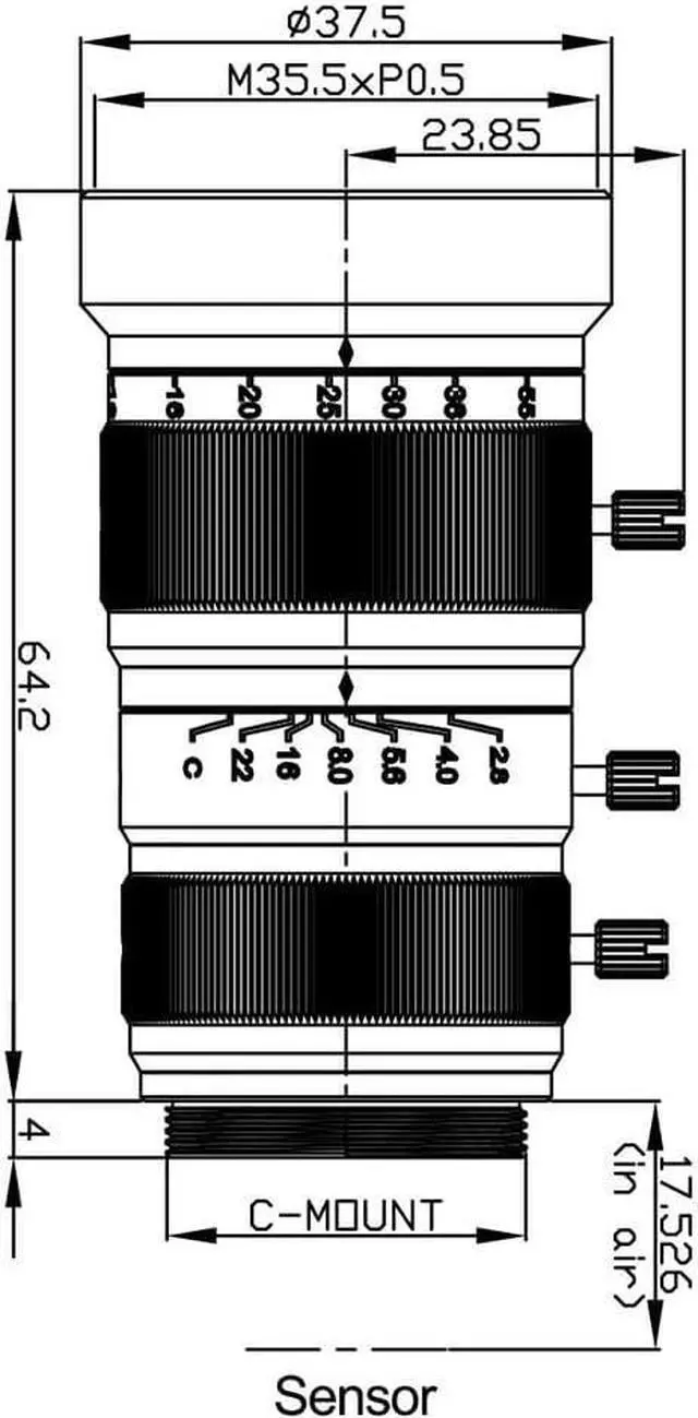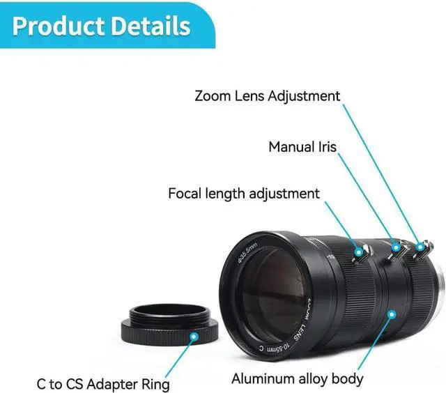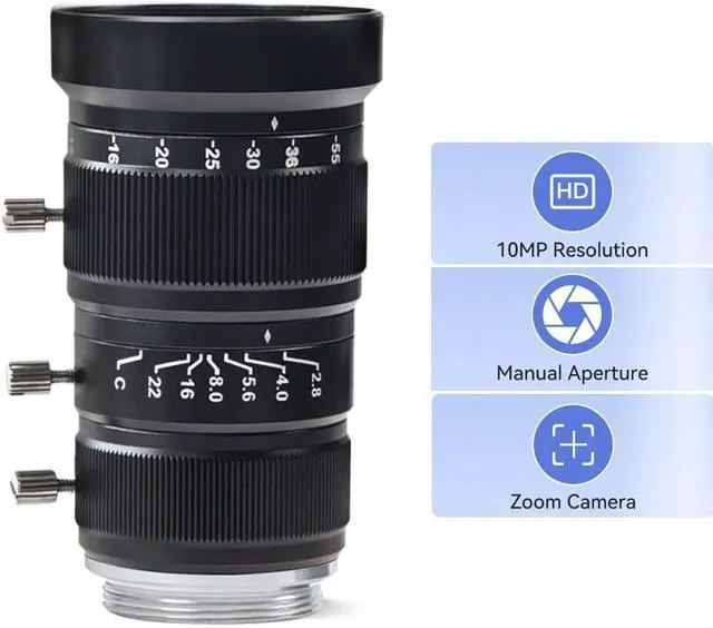 Specification:1/1.7 F2.8 telephoto zoom lens,10MP, C-Mount, Lens size is Ø37.5×64.2mm, weight is 118±2g, working temperature is -20°-60°.