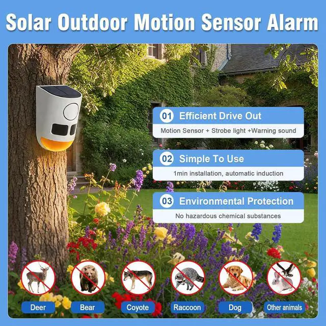 Solar motion sensor alarmThe motion sensor alarm outdoor have sturdy ABS casing, IP65 waterproof, sensing angle of is 125°, which will widely capture any movement within 5-8 meter activate the alarm to scare animals and thieves