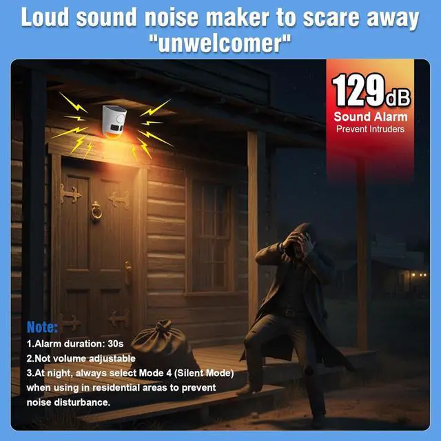 Say goodbye to the unwanted "explorers": ChunHee motion sensor alarm outdoor is triggered by motion sensor strobe light + 129db loud noise sound to scares away intruders and shields your home and property. More than 90% of users state that the invasion is significantly reduced after the first use the motion sensor alarm outdoor