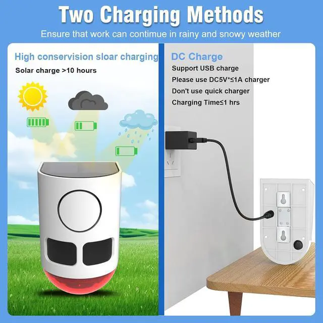 Solar & USB chargingThe motion sensor dog barking alarm equipped with a high capacity solar panel for 24/7 protection. USB charging as backup when long rainy days, Make sure it Non-stop work
