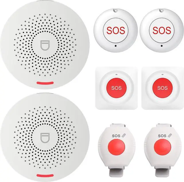 XUK WiFi SOS Caregiver Pager Call Button for Elderly, No Monthly Fee 2.4GHz Wi-Fi APP Control Wireless Nursing Call System with 2 SOS Call Panic Buttons & 2 Watch Pagers & 2 Square Pull Cord Pagers