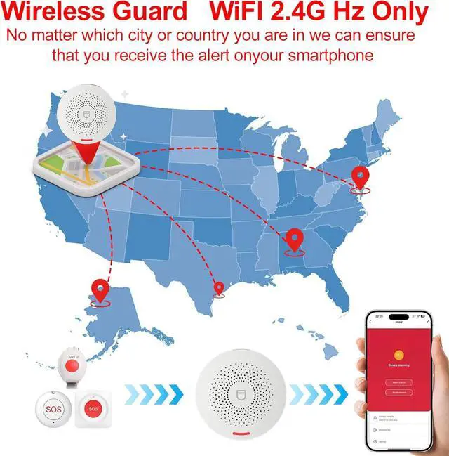 Wireless App ControlWhen the elderly press the emergency call button, the receiver not only sounds an alarm but also simultaneously sends an alert to your phone. Even when you're away, you'll receive the alert immediately and can take action right away, giving you greater peace of mind.