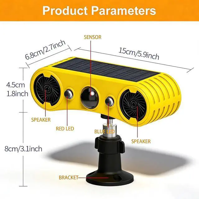 The use of high-efficiency solar panels can effectively improve the charging efficiency, the two-channel speaker provides 129dB*2 loud maker to provide greater volume, the red and blue strobe lights are more deterrent than red, and the sensitive infrared probe can help you catch uninvited guests.