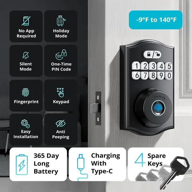 Biometric door lock for front door that ensures extra security by allowing you to add multiple digits before and after the correct PIN code. With 4 AA batteries installed, itll work for 12 months straight