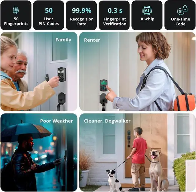 Stores up to 50 different fingerprints or passwords you can also unlock your door with keypad, one time codes, traditional keys we offer no wifi/app connections to enhance your security even more