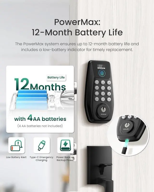 - : The C110 smart lock is equipped with the PowerMax smart power management system, ensuring up to 12 months of battery life. It features a built-in low-battery indicator and a Type-C emergency power port. *Battery life may vary depending on usage frequency