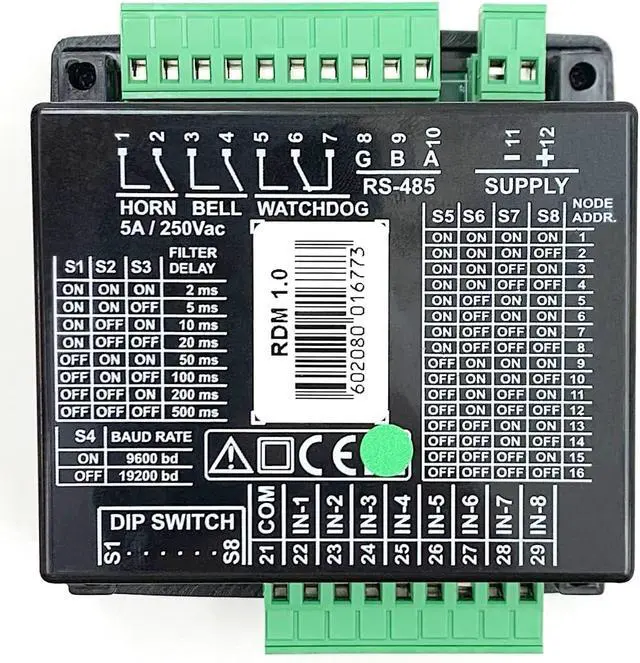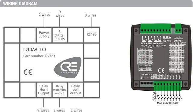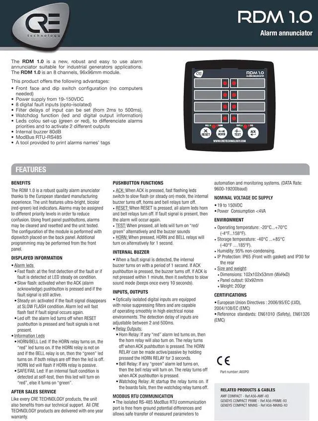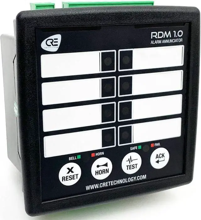 CRE - RDM 1.0 Alarm Annunciator (A60P0) The RDM 1.0 is a new, robust and easy to use alarm annunciator suitable for industrial generators applications. The RDM 1.0 is 8 channels, 96x96mm module.