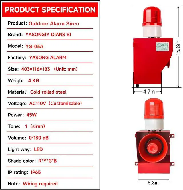 Operating PrincipleGeneral industrial alarm siren, when power on, it will send out siren sound and flashing light alarm, and it will stop when power off. There is no plug, wiring is required, the voltage is DC24V, please contact us if you need customized voltage.