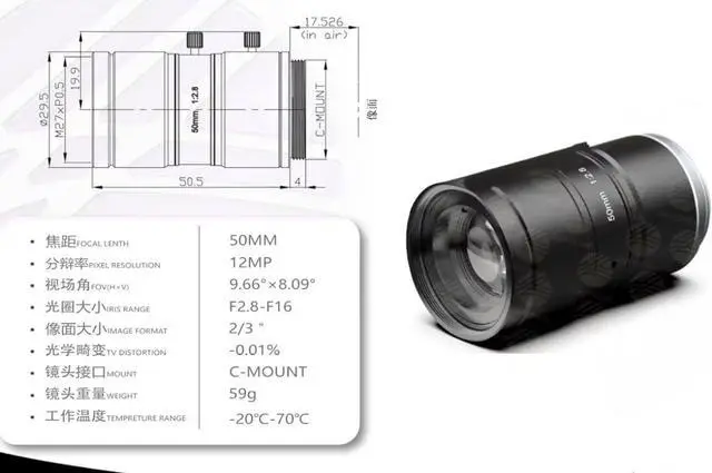 Fixed Focal Industrial Lens Low Distortion 12mp for 2/3'' Machine Vision Inspection (Millimeters, 50, C Mount)