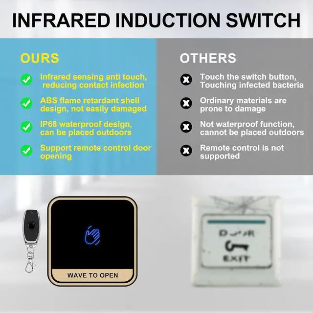 Wide Range of Applications Fingerprint access control systems prevent unauthorized entry. They support standalone access control mode, card reader mode, and other operating modes. Ideal for garages, hotels, shops, warehouses, laboratories, campus access control, identity verification, parking lot entrances, and other private locations. The system uses a sensor switch, supports remote door opening, and includes a doorbell, making it economical and affordable. Wiring is much easier than with ordinary doorbells, solving the pain point of doorbell wiring (doorbells require 2 AAA batteries; batteries are not included in the product).