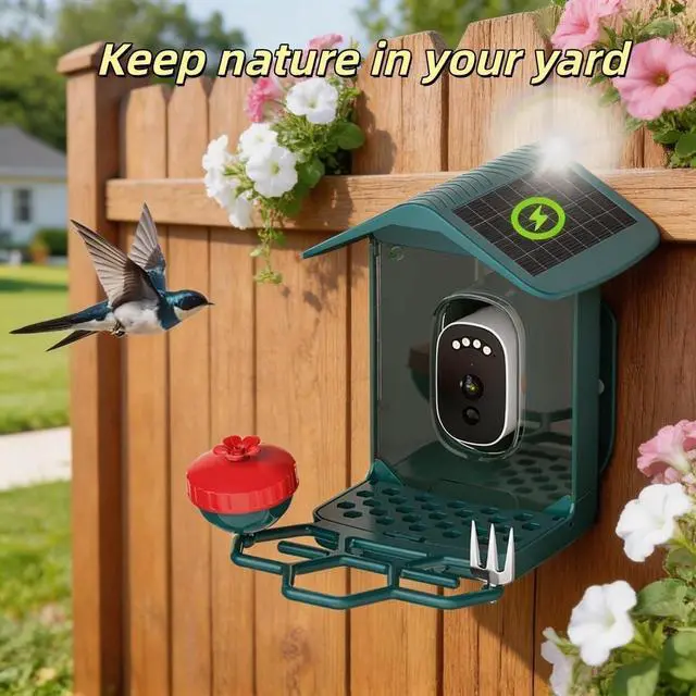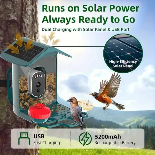 Solar Powered & Ultra-Long Battery LifeEquipped with a built-in solar panel, this wireless bird feeder camera stays charged effortlessly for continuous outdoor use. The high-capacity battery ensures ultra-long standby, so you wont need frequent recharging, even through cloudy days and winter months.