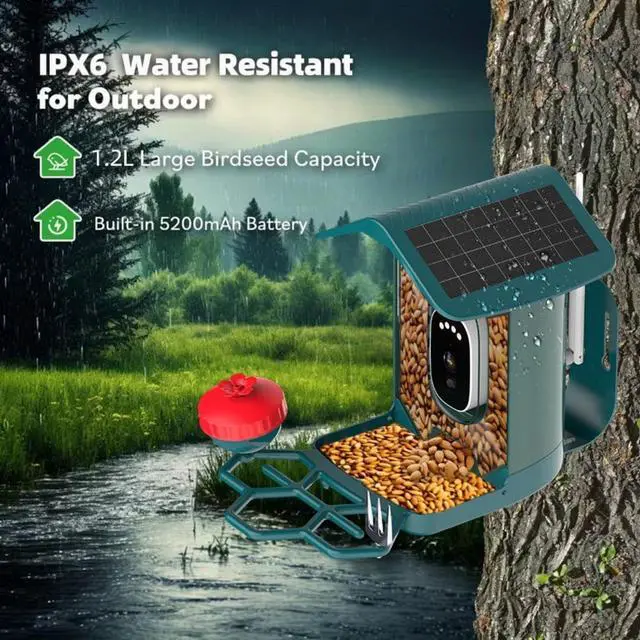 IP66 Waterproof & Durable Outdoor DesignBuilt to withstand rain, snow, and extreme temperatures, the IP66 waterproof rating ensures reliable performance in any weather. The compact, weatherproof housing blends seamlessly into your garden or backyard, protecting the camera and bird feeder from the elements.