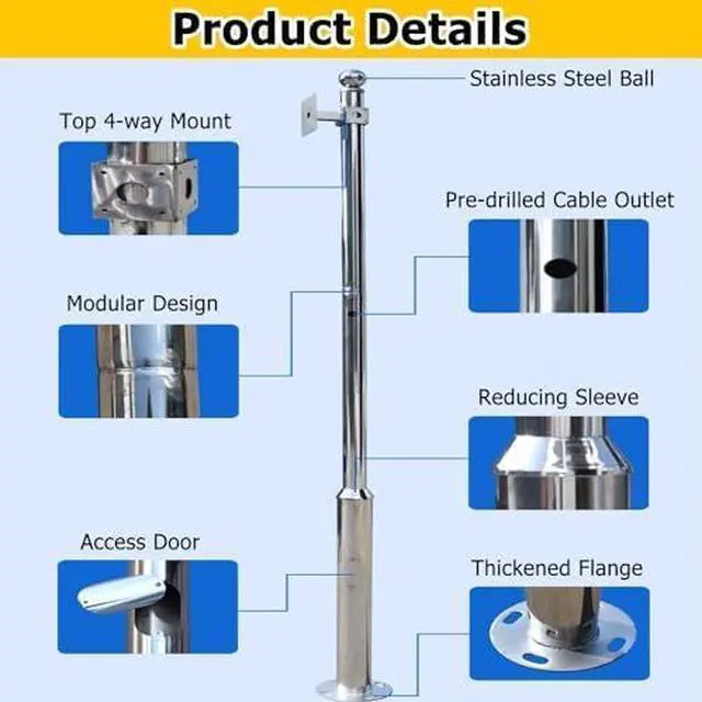 Crafted from 1.4 mm thick Round Stainless Steel Pipe, this Durable Outdoor Pole features segmented columns with varying diameters (7.6 cm for upper/middle, 11.4 cm for bottom). UV-Resistant and Rust-Proof, it withstands extreme temperatures and wind conditions, making it an ideal choice for your outdoor space. Enjoy long-lasting performance with this reliable pole.