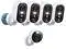 Includes four battery cam and one wired cam with metal plate and power adapters.