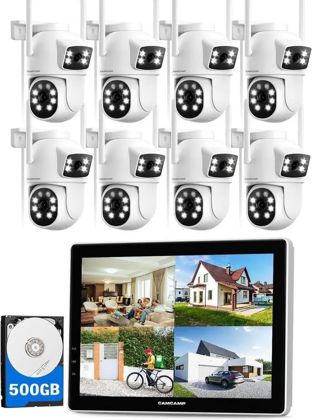 All-In-One, Plug & Play: Camcamp dual lens security camera comes with a 10.1" LCD monitor (NOT TOUCHSCREEN), all wifi cameras are auto-paired to the NVR monitor during the factory setting. 5min Installation, just plug in the outdoor cameras and nvr monitor into the power supply to get the live video, true plug and play. (NOTE: all cameras need to plug in the power all the time)