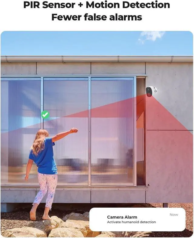 AI Human Detection + Sound and Light Alarm, Safer Active Defense: Equipped with AI human detection technology, it accurately identifies human activities, reducing false alarms caused by pets, fallen leaves, etc. Once an anomaly is detected, it immediately triggers spotlight and alarm sounds, actively deterring potential intruders. At the same time, it alerts you promptly, upgrading from passive monitoring to active protection.