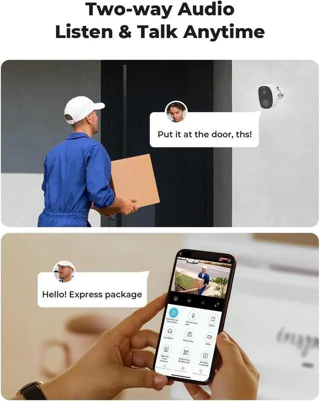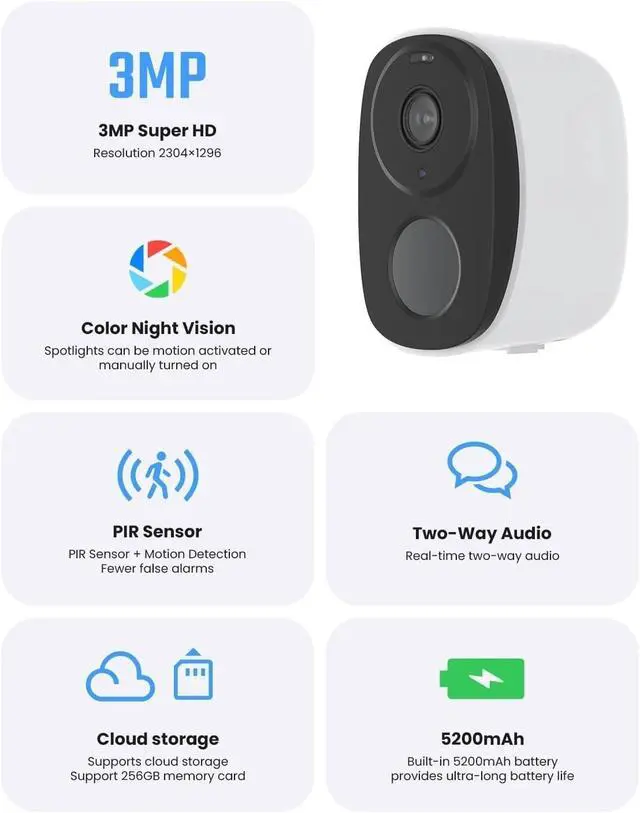 Wireless Connection: Supports WiFi connection, eliminating the need for complex wiring. It is simple and convenient to install by wall mounting. It can store motion-triggered videos on a 256GB SD card (self-provided), automatically overwriting old videos when full, or choose cloud storage for instant playback. It has built-in two-way voice, allowing for remote communication as if face-to-face, whether responding to visitors or instructing family members, it is clear and smooth.