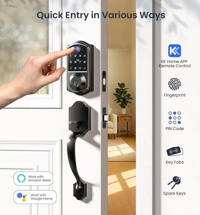 8-in-1 Keyless Entry Door Lock with Handle Set: Access the smart lock via Voice/Fingerprint/App/Password/Cards/Backup Key/User Authorization/Code Sharin