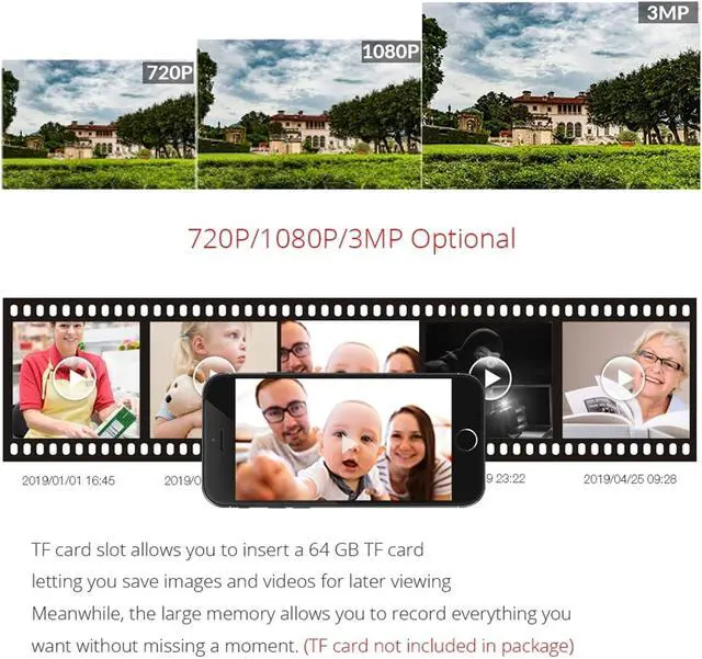 64G local storage +NVR Expansion Supports up to 64G TF card loop recording, compatible with third-party NVR devices, dual backup of important videos to ensure no loss!