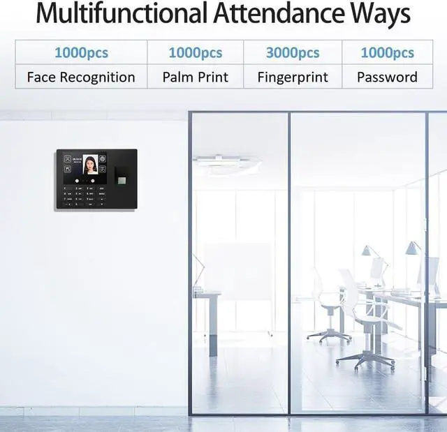 Multi-function 4-in-1 use: This time attendance device supports multiple employee identification methods, including 1000pcs face recognition, 1000pcs palm print, 3000pcs fingerprint, and 1000pcs password. With the capacity to store 160,000 records, it can meet the needs of various organizations.