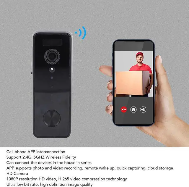Mobile APP Interconnection: Video doorbell adopts for Tuya APP as the connecting device, supporting 2.4G, 5GHZ Cordless Fidelity, which can connect the devices in the house in series, APP supports taking photos, video recording, remote wake up, quick capturing, cloud storage.