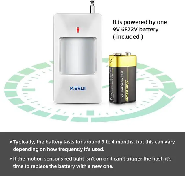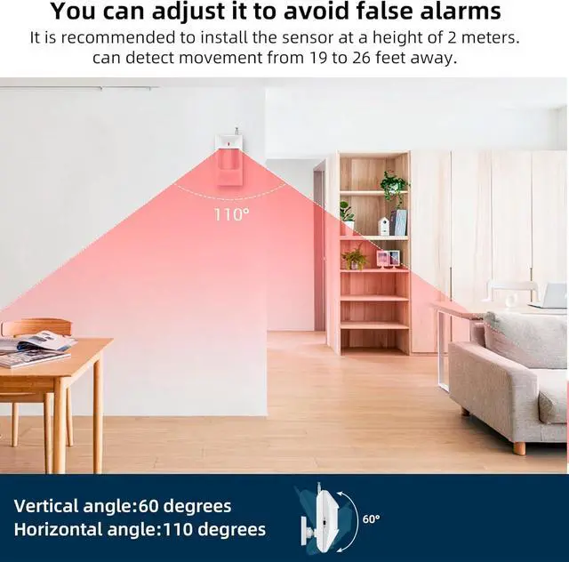The motion sensor can detect 6 to 8 meters with a vertical angle of 60 degrees and a horizontal angle of 110 degrees.