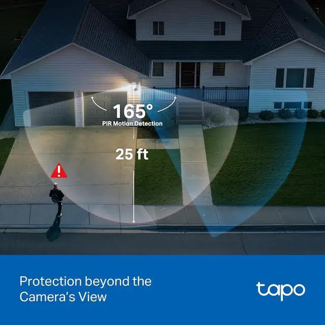 PROTECTION BEYOND THE CAMERA'S VIEW: The pan/tilt camera and PIR floodlight sensor work together to detect motion even when the camera is turned away. 25 ft, 165° PIR detection and 360° visual coverage help eliminate blind spots.