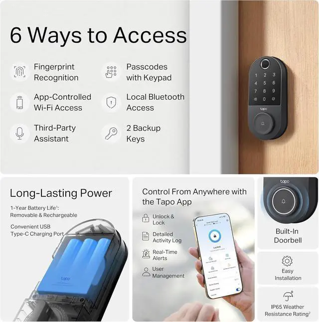 6 Ways to Securely Access: Access in six different ways: by fingerprint recognition, using custom passcodes on the keypad, manage from anywhere with Wi-Fi, via close-range Bluetooth, your smart home assistant, or by using the included backup keys.