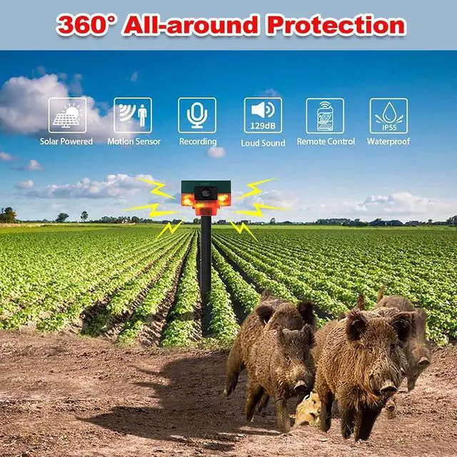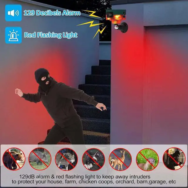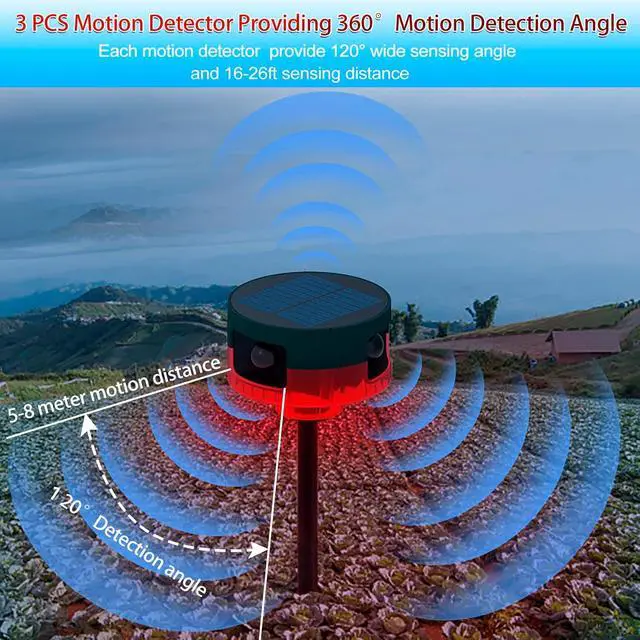 Unique 360° Motion DetectorOur solar security 129dB alarm light equipped with 3pcs motion detector, each motion detector provide 120° wide sensing angle and 16-26ft sensing distance. Provide 360° all-around protection.