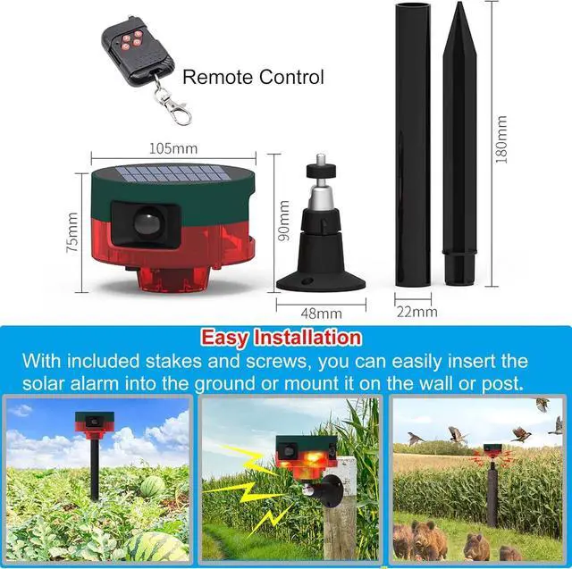 Wireless & Easy to InstallNo concern to worry about the hassle of electric wire. Simply find a place with sufficient sunshine and fix the outdoor motion sensor sound & strobe light alarm with supplied screws or ground stake. The Wireless warning alarm lamp could be sticked into the ground with stakes or mounted on the wall or post with the screws included.