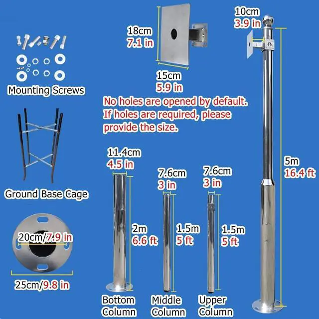 Security Camera Pole: Constructed from durable 1.4 mm thick stainless steel, this segmented column features a cross arm with adjustable lengths (A-10 cm, B-28 cm, C-30 cm). The upper and middle sections have a diameter of 7.6 cm, while the bottom measures 11.4 cm. Designed for outdoor use, it is UV-resistant, rust-proof, wind-proof, and withstands extreme temperatures, making it ideal for reliable surveillance.