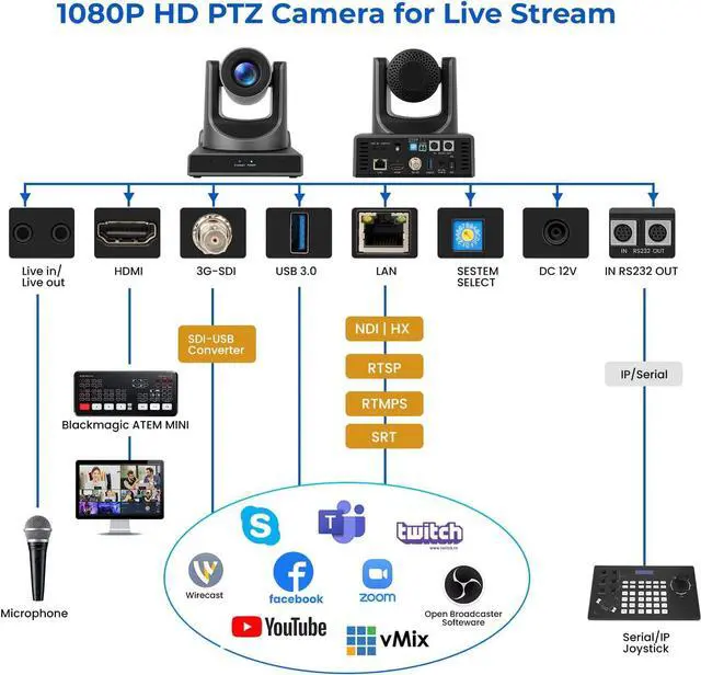 PTZ Camera Support 3G-SDI and USB 3.0 simultaneous outputs, IP Live Streaming Video Outputs and PoE(802.3af) supported,which makes motion video more fluent and clear under low bandwidth conditions, support Multi-ways to Control: RS232 & RS485 (Serial Joystick), IP(IP Joystick) , You can use streaming camera connection to SDI as a camera for video
