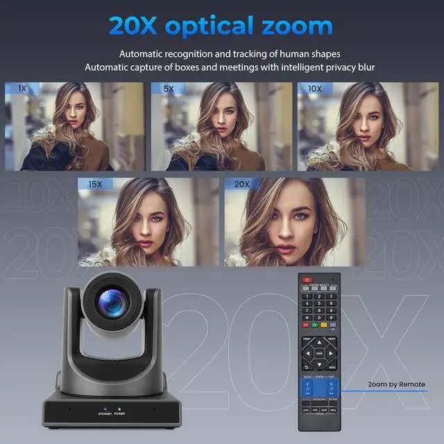 20x optical zoom camera and IP Live Streaming Camera easy multiple ways control. Pan, tilt and zoom the camera can be easily controled via IR remote control/web portal/web interface/RS232 / RS485/IP. You can power, control, set up and preview this video camera over a single Ethernet Cat5/6 cable, PoE Supports, Suitable for Church service & Worship, Education, Teaching Broadcast, Conference, Esports, Events etc.