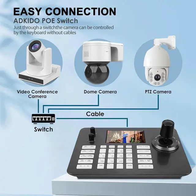PTZ camera controller supports standard network surveillance protocol,the ADKIDO network PTZ video conference Controller works with Linux system and all other IP PTZ cameras.Support max 999 equipments at the same time