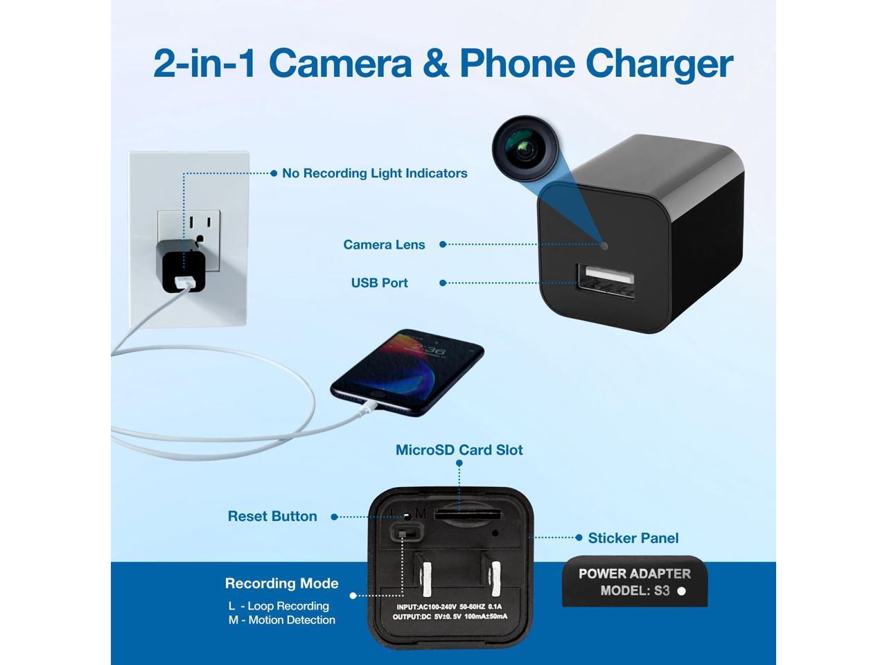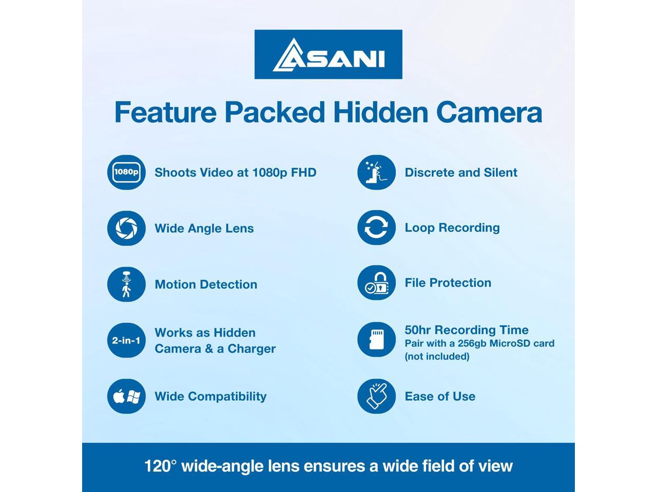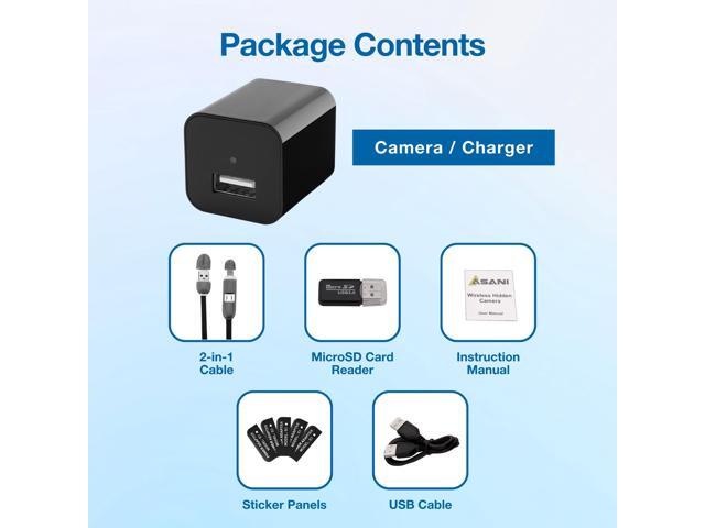 - PLUG & PLAY CONVENIENCE: Just insert a micro SD card, plug it into a power outlet, and then let it keep an eye on your space. Supporting up to a 256GB SD card (not included), Asanis camera charger is your smart recorder for comprehensive evidence.