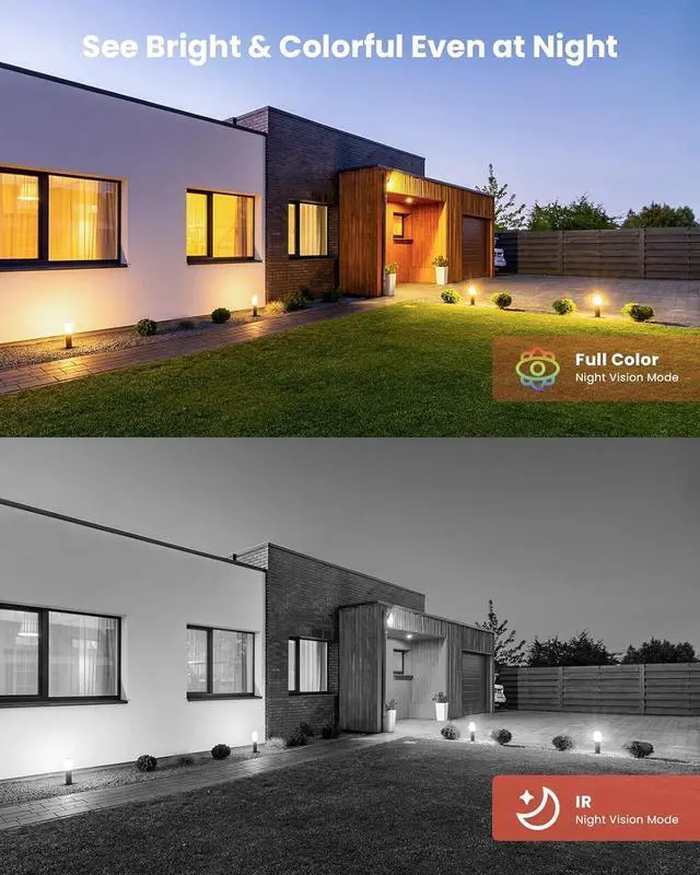 Vibrant Night Vision up to 100ftEquipped with 3 dual-core LEDs, the cameras auto-switch from infrared to full-color mode when detecting motion. Enjoy vivid color vision within 50ft, and clear detail up to 100ft ensuring round-the-clock visibility.