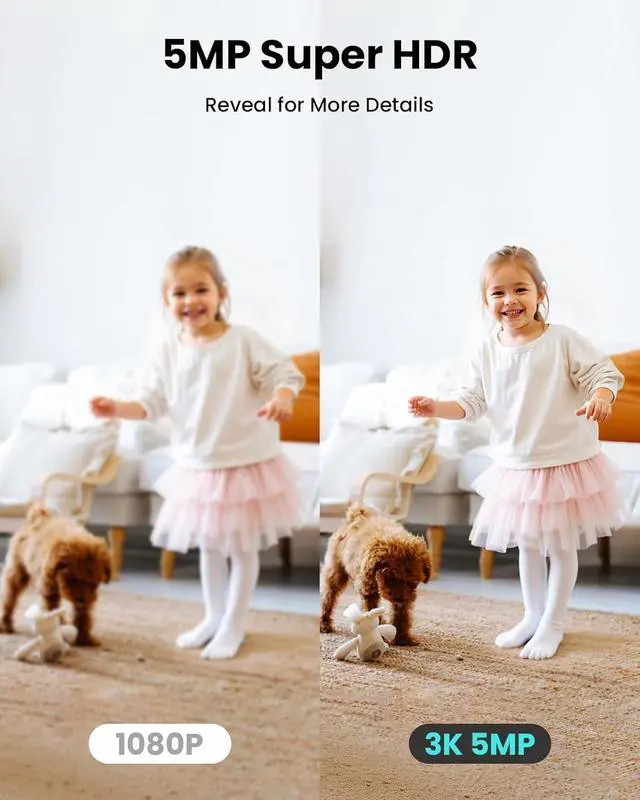3K Super HD & Complete 360° Coverage Experience exceptional clarity with 3K resolution for sharp details day and night. The camera rotates 355° horizontally and tilts 120° vertically, offering a true 360° panoramic view with 4x zoom to eliminate blind spots and monitor your entire room.